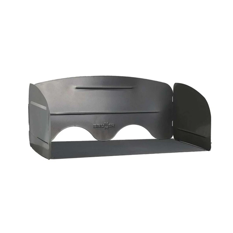Selbststehender Kocher-Windschutz mit hitzeresistenter Basisplatte, klappbar und aus pulverlackiertem Metall gefertigt. Für 2- und 3 Flammkocher geeignet.