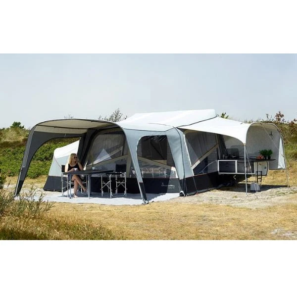 Camp-let Passion bietet standardmäßig die Möglichkeit, eine Außenküche vorzusehen. Mit dem Passion Küchensonnendach lässt sich eine optimale Außenküche gestalten – geschützt vor Regen und Sonne. Das Küchensonnendach wird mit dem Dachreißverschluss befestigt und hat eine gebogene Front.