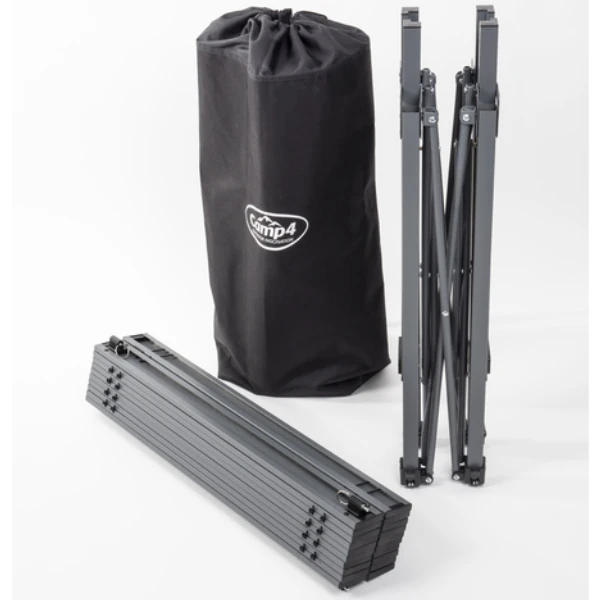 Stabiler Aluminium-Rolltisch für 4-6 Personen mit anthrazitfarbener Platte und Aluminiumgestell. Bequemes Sitzen ist auch an den Stirnseiten möglich.