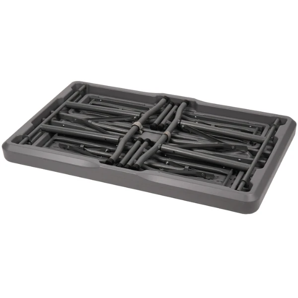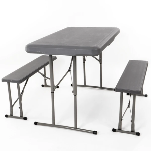 Garnitur bestehend aus einem Tisch mit zwei Bänken. Diese werden platzsparend in der Tischplatte fixiert. Oberflächen Material HDPE in grau, Gestell aus Stahlrohr.