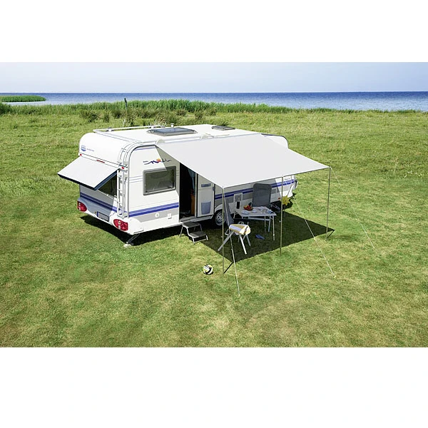Das Sonnendach Flora macht sich überall nützlich: als mobiler Carport am Heck des Caravans, als Schutzdach für den Flaschenkasten oder an der Seitenwand als Markise, die ein schattiges Sitzplätzchen bietet.