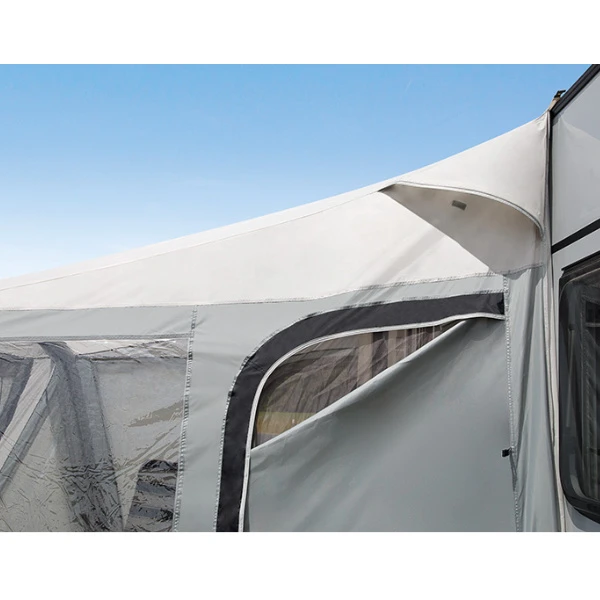 Seitenwände: Beide Seitenwände mit großem und kleinen Klarfolienfenster inklusive Gardine und einer seitlich wegrollbaren Tür. Hinter der Tür zusätzlich ein seitlich wegrollbarer Gazeeinsatz der durch Reißverschluss verschließbar ist und vor Insekten schützt. In beiden Seitenwänden eine abgedeckte Hochentlüftung. Bei Regenwetter bietet die Hochentlüftung Schutz und sorgt für eine Dauerbelüftung im Zelt