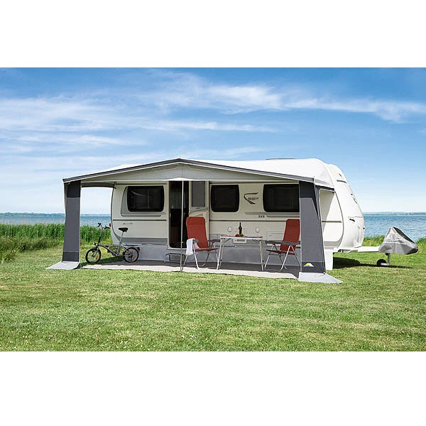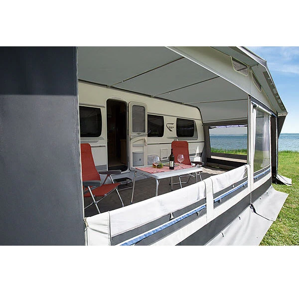 Seitenwände: herausnehmbar; beide Seitenwände verfügen über ein großes Lüftungsfenster aus Moskitogaze mit verschließbarer Prägefolienklappe durch Reißverschluss, das auch bei schlechtem Wetter benutzt werden kann. Die verschließbare Prägefolienklappe ist hochrollbar sowie einseitig als Lüftungshaube ausstellbar. Auch bei Regenwetter bietet diese Lüftungshaube Schutz und sorgt für eine wetterunabhängige Dauerbelüftung im Zelt. Eingangstür seitlich wegrollbar; Erkeranbau an der rechten Seite möglich.