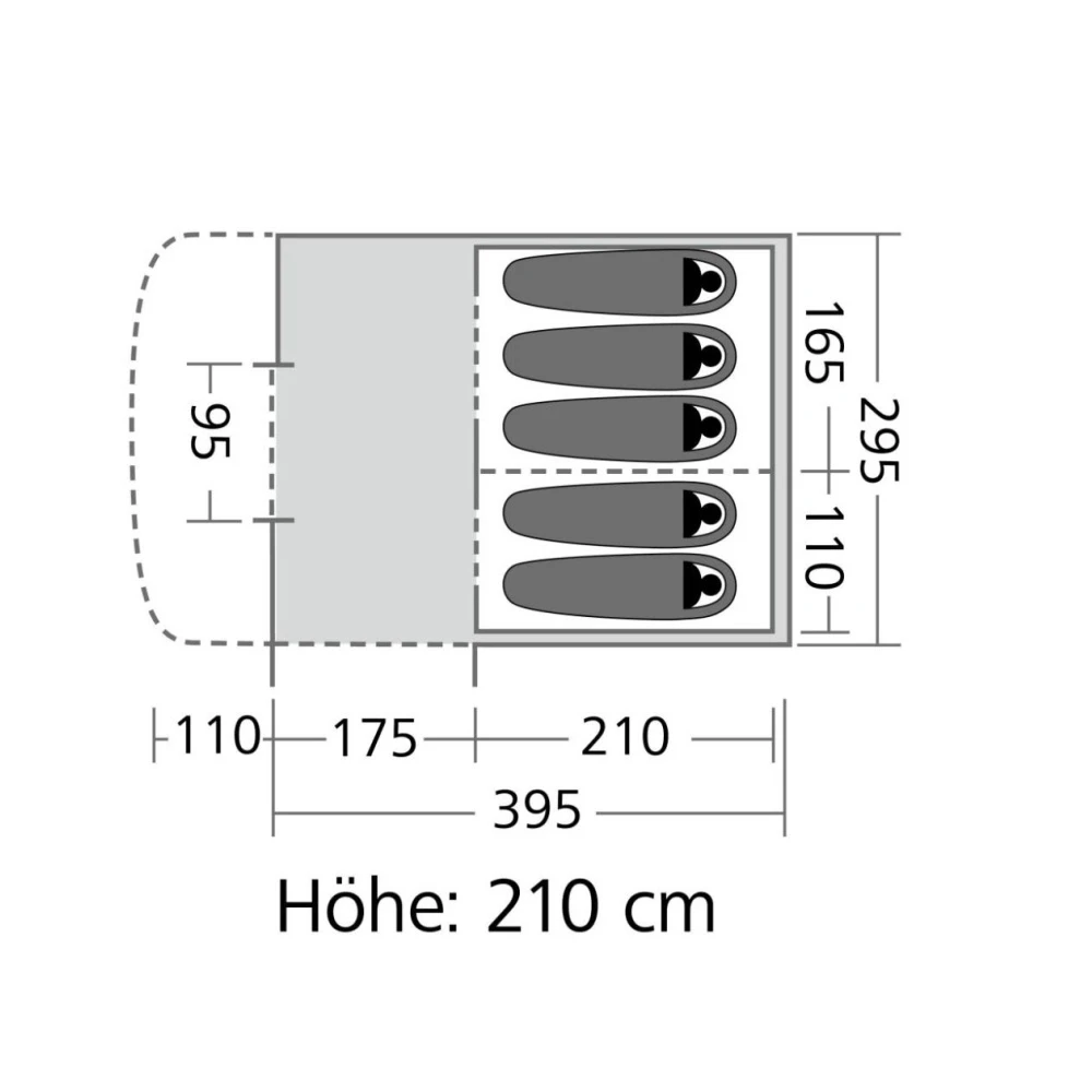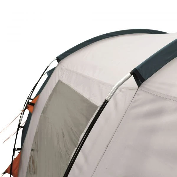 Das große Tunnelzelt, das die Lüftungsöffnungen vor Regen schützt, bietet viel Stauraum und Schutz und verfügt zudem über zwei halbrunde Türen für einen leichten Zugang. Der angenähte Zeltboden schützt vor unangenehmer Zugluft und lästigen Insekten. Dank des vorgebogenen Glasfasergestänges ist ausreichend Stehhöhe vorhanden.
