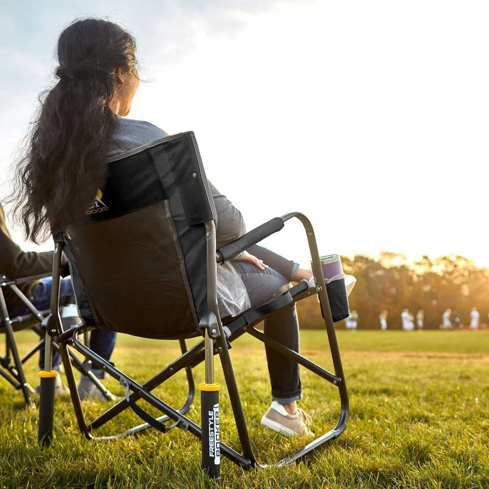 Der Camping-Schaukelstuhl ist leicht zu transportieren und aufzustellen. Mit ihm schaukeln Sie sanft vor und zurück – egal, wo Sie gerade sind. Dank der patentierten Eazy-Fold Technologie lässt sich der Stuhl sicher und einfach auf- und wieder zusammenfalten. Die Rückenlehne ist mit einem strapazierfähigen Nylonnetz ausgestattet und sorgt so für kontinuierliche Luftzirkulation. Für den leichten Transport ist ein Tragegriff integriert. Die patentierten federgelagerten Stoßdämpfer (Spring-Action Rocking Technology) sorgen für eine sanfte Schaukelbewegung. Beliebte Verwendungszwecke: Grillpartys, Camping, Picknicks.