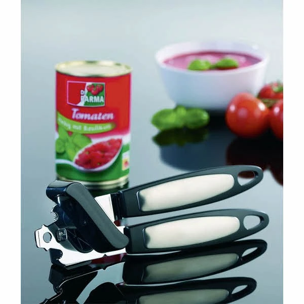 Der Antrieb wird über das Flügelrad ausgeführt. Messer und Rädchen sind aus gehärtetem Stahl und garantieren einen sauberen Schnitt. Mit dem integrierten Kapselheber am Kopf des Dosenöffners lassen sich auch Kronkorken von Flaschen entfernen. Durch die Spitze lassen sich Vakuumverschlüsse leichter lösen.