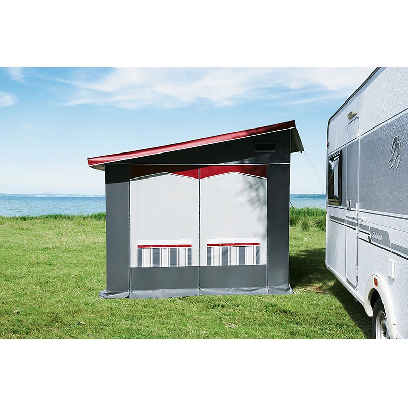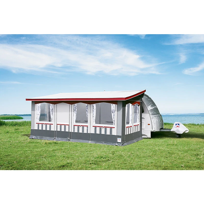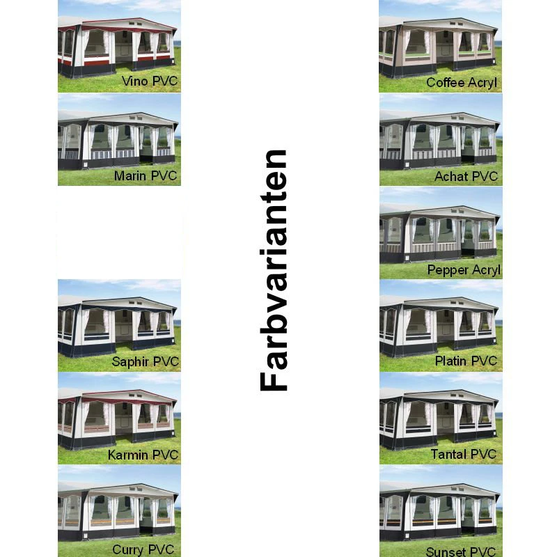 Lieferumfang: Vorzelt, Gestänge, Schürze, Gardinen, Abspannmaterial, Packsäcke, Radkastenabdeckung, Deichselhaube, Rückwand und Schaumstoffpolster.