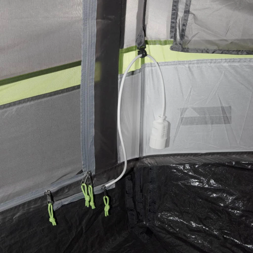 Die High Peak 3-Stufen Dual Flow Ventilation im Schlafbereich passt sich jeder Wettersituation optimal an. 1. Tropische Nächte: Das große Moskitofenster zu 100 % öffnen. 2. Trockenes Wetter: Abdeckklappe variabel zu 30-50 % je nach Bedarf öffnen. 3. Schlechtes Wetter: Abdeckklappe zu 100 % schließen. Die Reißverschluss-Abdeckung ist mit einer zusätzlichen Regenrinne ausgestattet. Die Regenrinne schützt zusätzlich gegen das Eindringen von Nässe. Kabeleingang mittels Reißverschluss und Kabelführung für Beleuchtung. Abgedunkeltes Innenzelt mit Vario Vent Control System. Der Moskitonetz-Eingang hält lästige Plagegeister fern und kann bequem von innen je nach Klima variabel bedient werden.