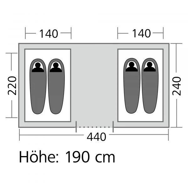 Der große Abstand zwischen Außen- und Innenzelt reduziert die Bildung von Kondenswasser. Die zwei separaten Innenzelte sind mit Moskitonetz-Türen, praktischen Organizern und Innenzelttaschen ausgestattet. Zwei Lampenhalter runden den Komfort ab. Die farblichen Positionsmarkierungen erleichtern das Einhängen der Innenzelte.