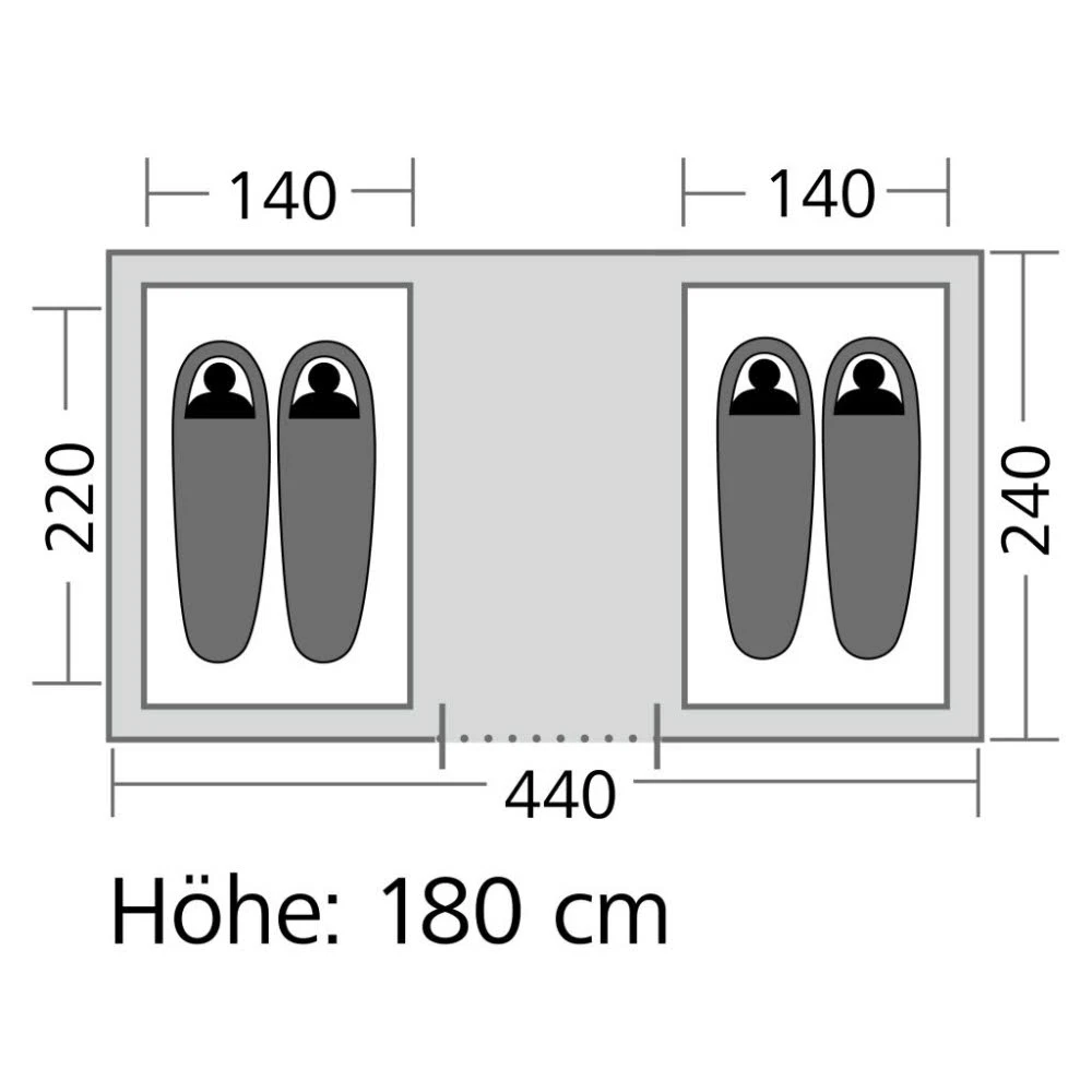 Zelt mit gegenüberliegenden Schlafkabinen. Das Außenzelt wird zuerst aufgebaut und dann das Innenzelt eingehängt. Das hat den Vorteil, dass das Innenzelt bei regnerischen Wetter trocken bleibt. Tagsüber kann das Innenzelt zur Wohnraumvergrößerung ausgehängt werden. Die Eingänge mit der Schlafkabinen mit ganzflächigen Moskitonetztüren bieten optimale Belüftung und Insektenschutz. Organizer, Lampenhalter und Innenzelttaschen runden die Ausstattung ab.
