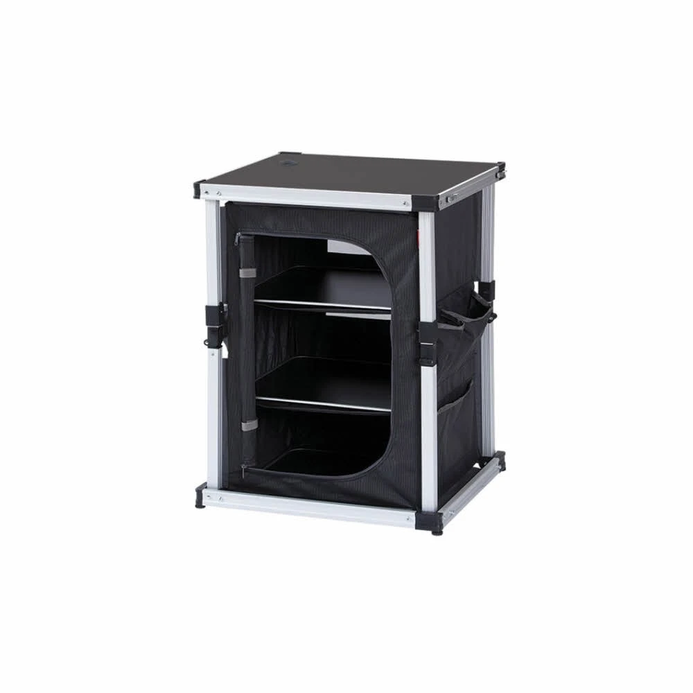 Aufbewahrungsschrank mit 3 Ablagen, stabilem Boden und stabilem Deckel. Dank einer intelligenten Klapptechnik in wenigen Sekunden auf- und wieder abgebaut. Für stabilen Stand sorgen 4 verstellbare Schrauben an der Bodenplatte. Inklusive Transporttasche.