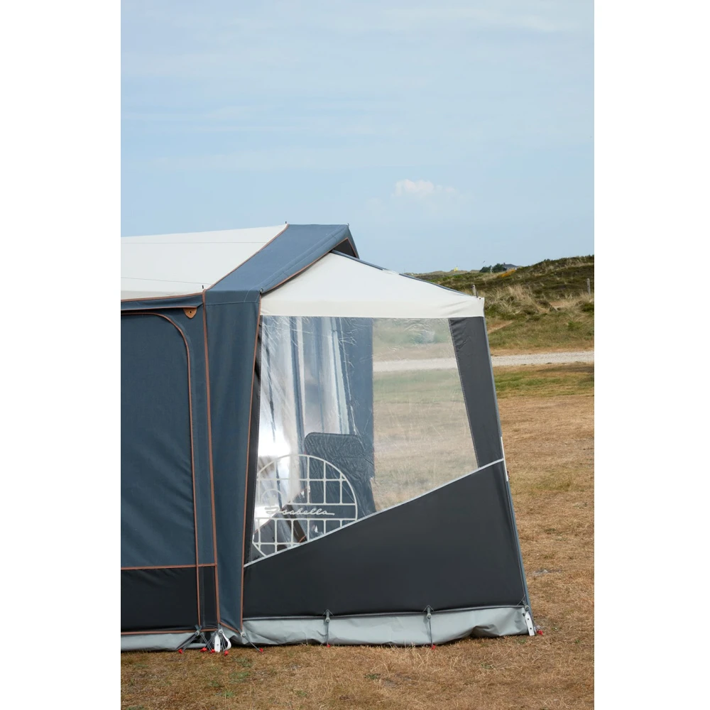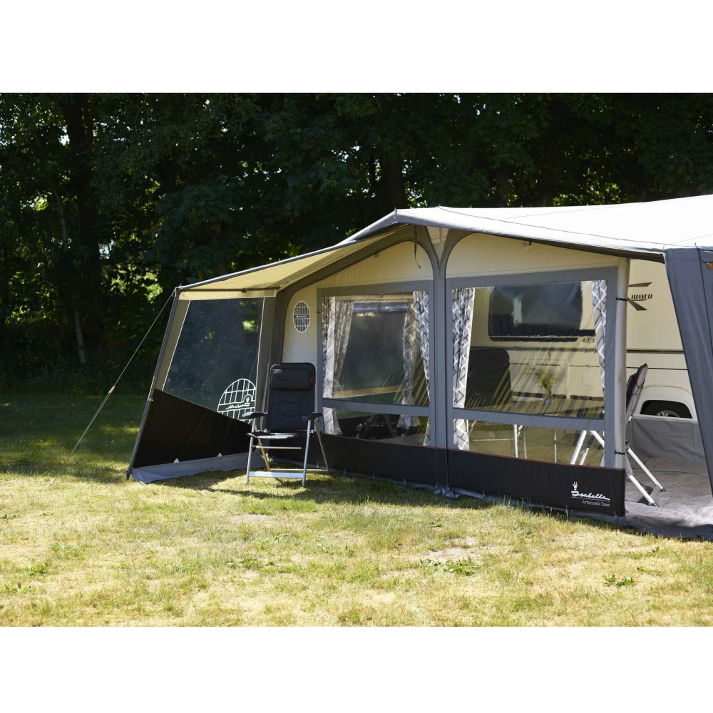 Eingangsdach rechts wie auch links montiert werden oder auch als Schattenspender in der Mitte. Setzt man mehrere Module aneinander, so kann man sogar den vorderen Bereich komplett überdachen. Verbunden und aufgestellt wird das Modul mit TectumPro-Verbindern und leichten CarbonX Stangen unter unter dem Vordach des Vorzeltes.