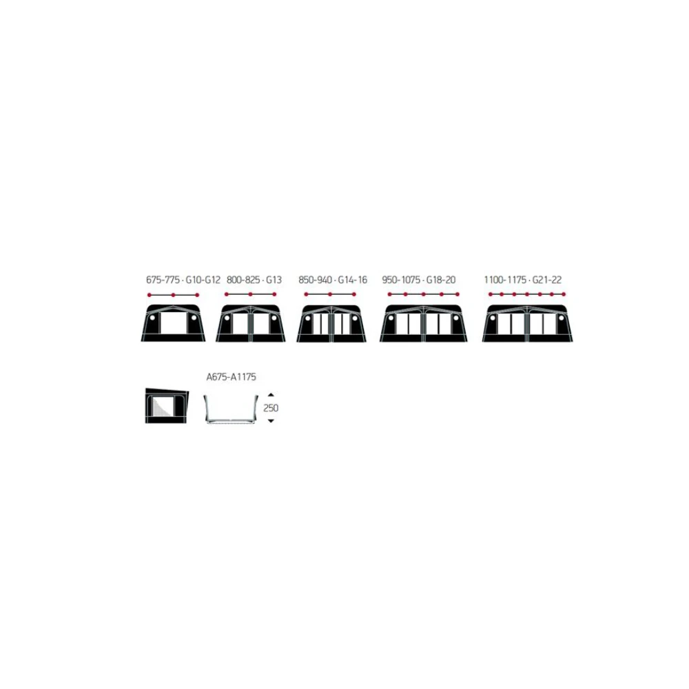 Serienausstattung: Gardinen „Cube Creme“, Verandastange, Vordachspannstangen, Windblende, Radkastenabdeckung, schraubenfreie FixOn-Beschläge, Zelttasche, Gestänge- und Heringssack und Heringsauszieher (zusätzlich ab Größe 950: 2 Dachstangen, ab Größe 1000: 2 Dachstangen und 2 StĂĽtzstangen, ab Größe 1100: 4 Dachstangen und 2 StĂĽtzstangen).