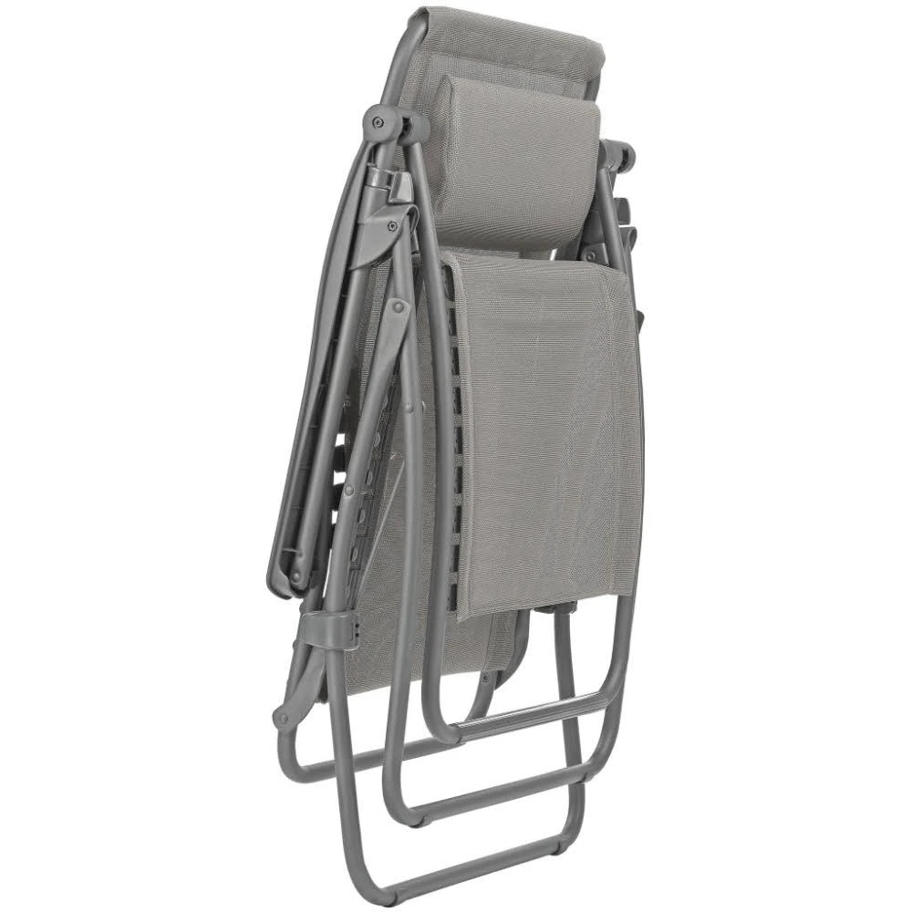 Der Stuhl passt sich an das Körpergewicht an. Der Bezug ist UV-beständig und leicht zu reinigen. Ergonomisches, verstellbares und abnehmbares Kopfpolster. Rahmen aus lackierten Stahlrohren (D=20 mm).