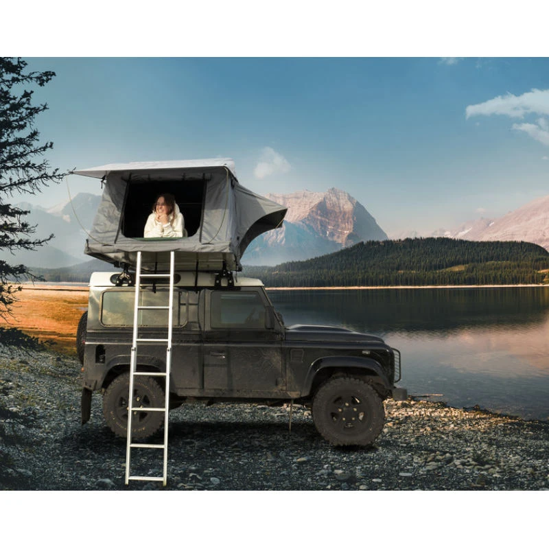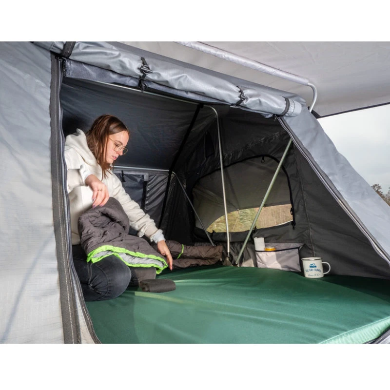 Geliefert wird das Dachzelt mit einer bequemen, 6 cm dicken Matratze (mit abnehmbarem, waschbarem Bezug), einer Aluminium-Teleskopleiter und Spannstangen, mit denen die seitlichen Öffnungen aufgestellt werden können.