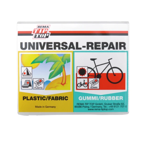 Reparatursortiment zur Reparatur von Artikeln aus Plastik, Kunstleder, Weich-PVC mit Gewebeoberfläche und Gummi wie zum Beispiel Schlauchboote, Planschbecken, Zelte, Planen, Regenjacken und Fahrradschläuche.
