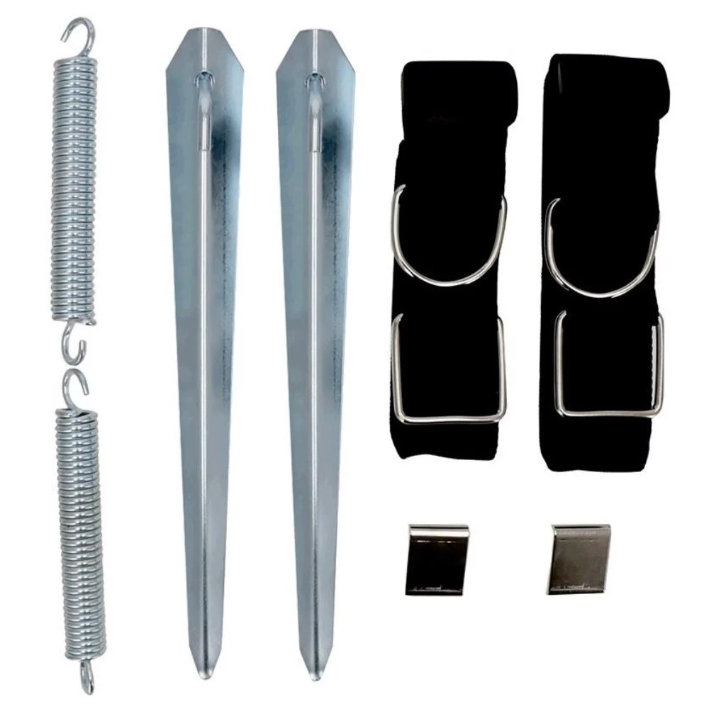 Lieferumfang: 2 verstellbare Gurte, 2 Sturmheringe und 2 Zugfedern.