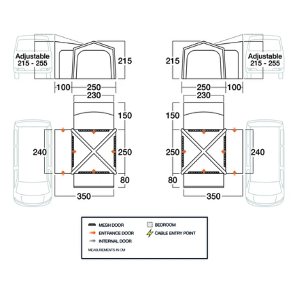 - Anbau- und Schlafzimmeraufsätze können so angeordnet werden, dass Sie wählen können, ob Ihre Markise nach vorne oder zur Seite ausgerichtet ist. Die Vielseitigkeit macht sie auch zur idealen Wahl für Fahrzeuge mit einer rechten Seitenschiene.