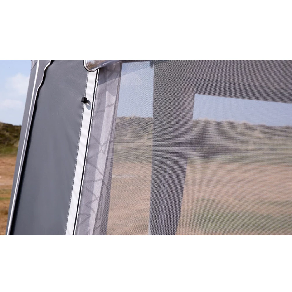 Serienausstattung: Schraubenfreie FixOn Beschläge, Gardinen „Luxor Grey“ (inkl. Seitenwand), Windblende & Radkastenabdeckung, Abspannmaterial, Zelttasche und Gestängesack.