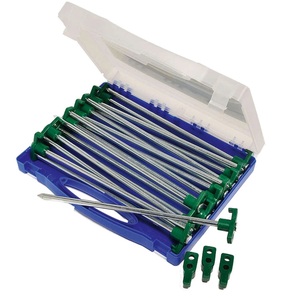 Inhalt: 20 Felsnägel mit Haken, 20,3 cm lang, D=6,5 mm. Für harte Böden. Inklusive Kunststoffkoffer.