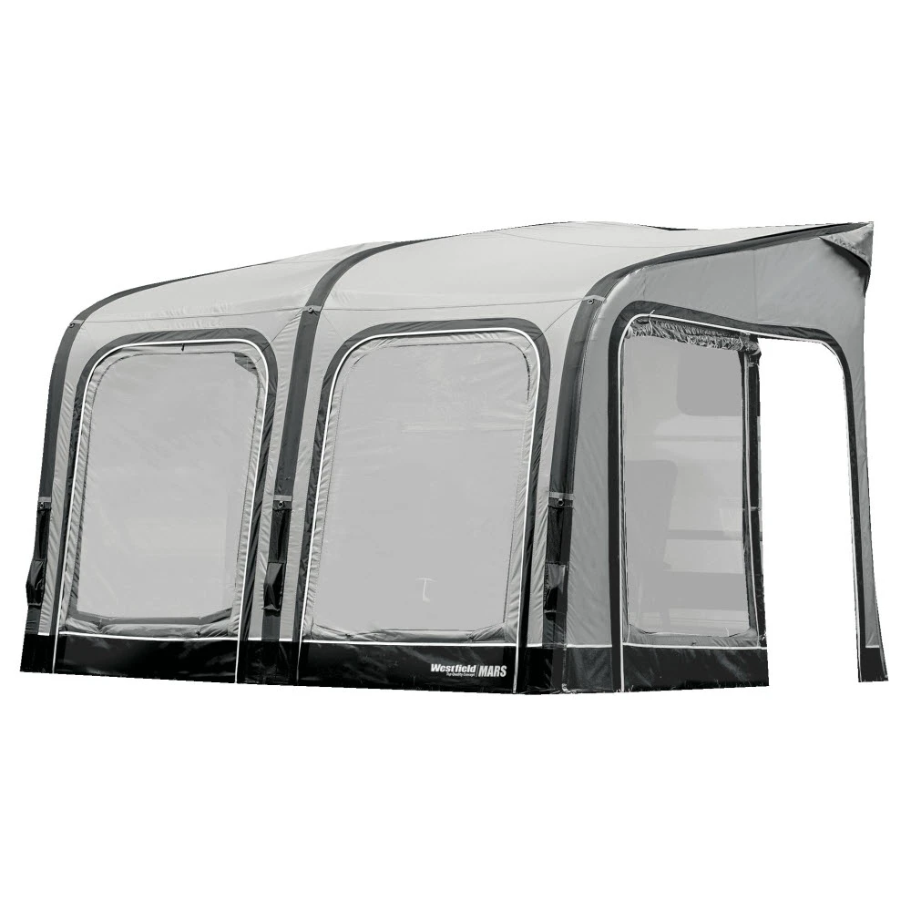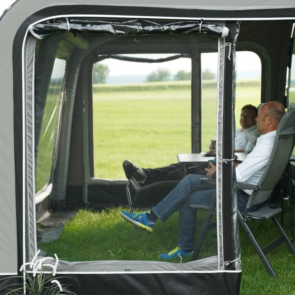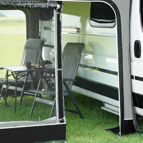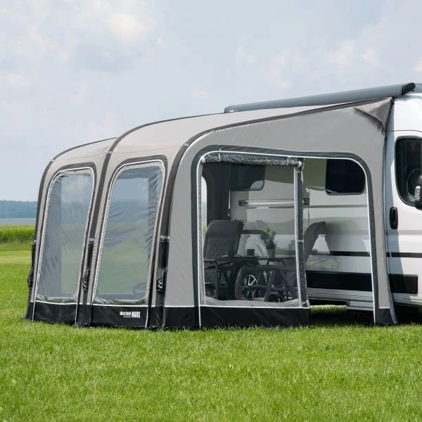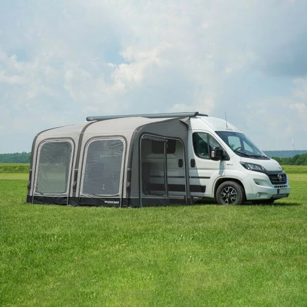 Starten Sie Ihren Urlaub mit dem Luftvorzelt Mars mit einer Vorzelttiefe von 250 cm. Erleben Sie eine hohe Passgenauigkeit und eine perfekte Breite für Ihren Kastenwagen. Alle Fenster-/Türen-Segmente können komplett barrierefrei in kurzer Zeit entfernt werden. Dann entsteht ein praktisches Sonnendach. Der doppelte Schmutzstreifen sowie die dauerhafte Ventilation durch die Hochentlüftung bieten ein komfortables Busvorzelt.